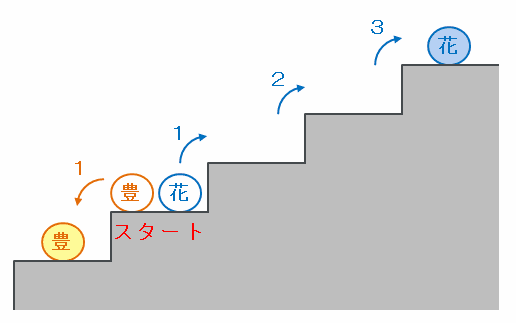 2人が同じ段にいる状態で1回じゃんけんをして花子さんが勝ち、豊子さんが負けると、