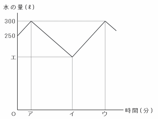 次のグラフのアには、水道から毎分10リットルずつ水を入れたとき、水そうに300-250=50リットルの水を入れるのにかかる時間があてはまるので、答えは50÷10=5(分)になります。