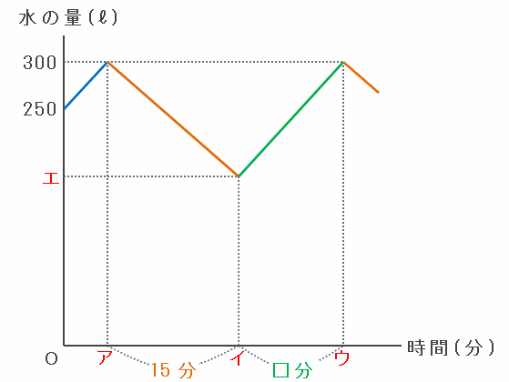 また、水そうに300リットルの水がたまった後は、排水口から15分間水が出て、水そうの水が減り続けるので、グラフのイには5+15=20(分)があてはまります。