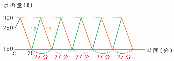 を繰り返すので、水そうの水の量は12+15=27分ごとに180リットルまで減ります。