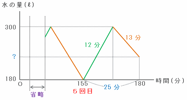 水そうの水の量が6回目に180リットルまで減るのは、スタートしてから20+27×5=155分後なので、3時間=180分まで、あと180-155=25分間残っています。