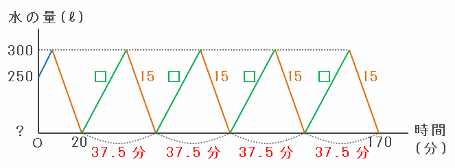 また、その37.5分のうち、排水口を開いているのは15分間なので、排水口を閉じてからの37.5-15=22.5分間で、水そうの水の量は300リットルまで増えることも分かります。