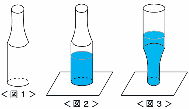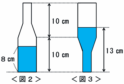 次に、<図2>のビンにふたをして、ビンをひっくり返したところ、<図3>のように水面の高さは13㎝になりました。このビンの容積は何㎤ですか。ただし、円周率は3.14とします。