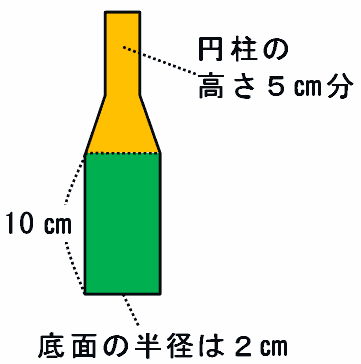 つまり、ビンの中の体積の合計は円柱部分の高さ8+7=15㎝分の体積と等しいので、答えは2×2×3.14×15=188.4㎤になります。