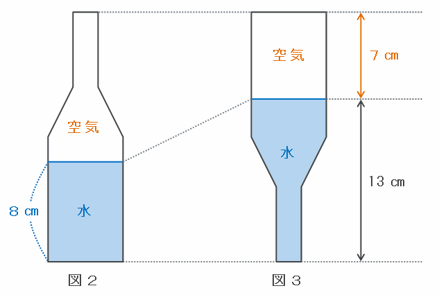 また、図3のようにビンをひっくり返したら水の深さが13㎝になったことから、空気の体積は円柱部分の深さ20-13=7㎝分にあたることも分かります。