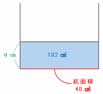 まずは容器に直方体を入れる前の水深を求めておくと、次の図のように192÷48=4㎝になります。