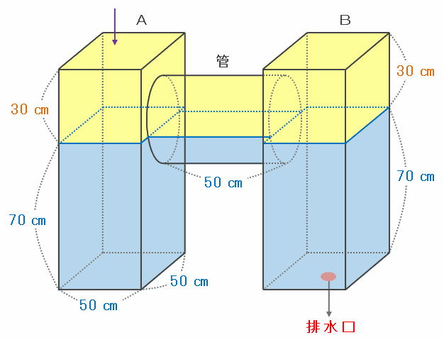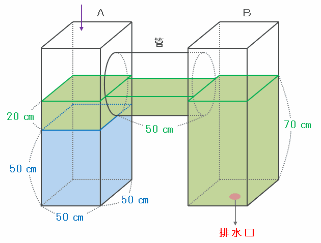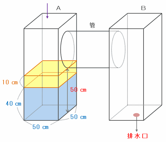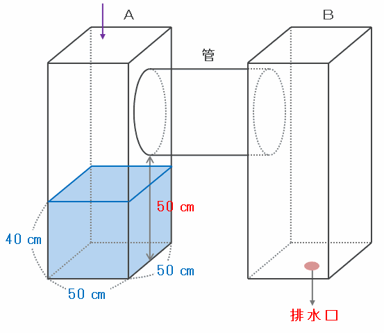 上の図でAの容器にたまった水の量は50×50×40=100000㎤=100リットルです。