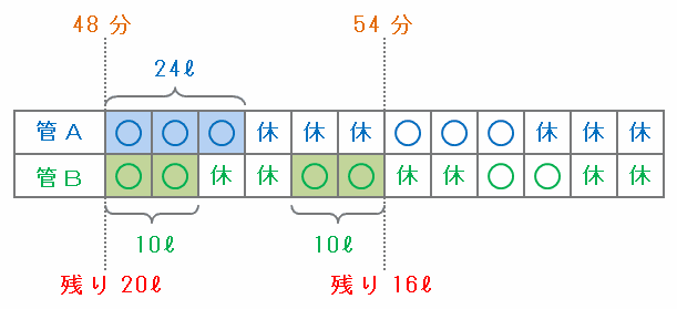 上の表を見れば分かるように、管Aは「3分開く」が2回あるので、12分間で8×3×2=48リットルの水がタンクへ注がれます。