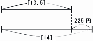 このとき、下の線分図のように、[14]と[13.5]の差である[0.5]が、値段の合計の差である225円にあたります。