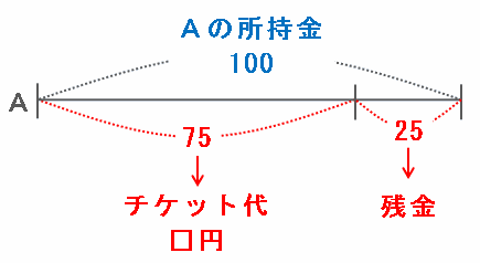 下の図のように、Aの最初の所持金の割合は100、そして残金の割合は25なので、Aが払ったチケット代の割合は100-25=75だと分かります。
