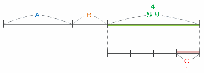 次の図のように、CはAとBが取った後の残りの4分の1をとったので、最後にCがとったピザの量を1とおくと、AとBがとった後の残りのピザの量は1÷4分の1=4と表せます。