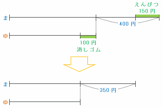 文房具店でまゆみさんが払った金額は30×5=150円、ゆかさんが払った金額は50×2=100円なので、次の図のように、2人の所持金の差は150-100=50円縮まり、400-50=350円になります。