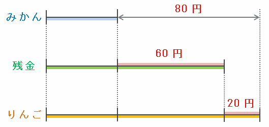 上の図から、りんご1個の値段はみかん1個の値段よりも60+20=80円高いことが分かります。