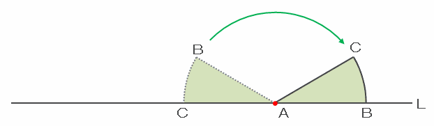 おうぎ形ABCが点Bを中心として、次の図のように辺ABが直線Lに対して垂直になるまで回転するとき、おうぎ形の頂点Aは図の青い矢印のように動きます。