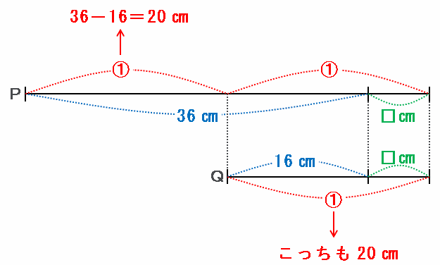 上の線分図の点Pと点Qの線にはどちらも「□㎝」があるので、2本の線の長さの差は36-16=20㎝です。