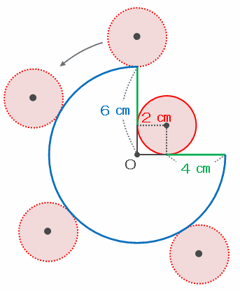 半径2㎝の円が、次の図のようにおうぎ形のまわりを転がりながら1周するとき、円の中心が通ってできた線は、
