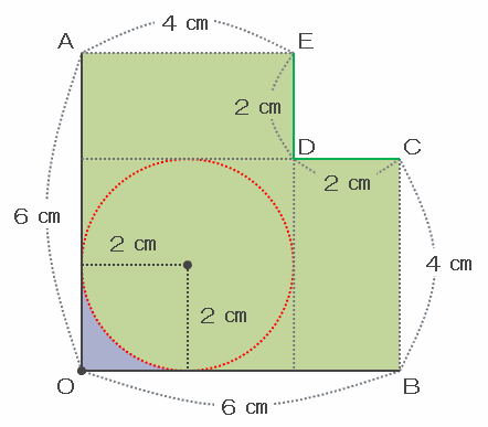 おうぎ形のまわりを、次の図のように半径2㎝の円が通過した部分の面積は、図の「青い食べかけのドーナツ」と「オレンジ色のおうぎ形2個」と「緑色のL字型の図形」の面積の合計から、中心Oの近くにある「小さな紫色の部分」の面積を引けば求められます。