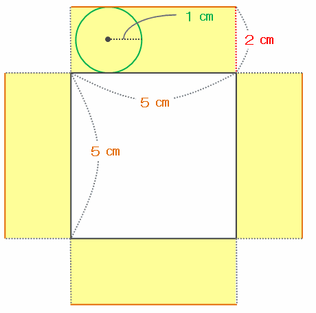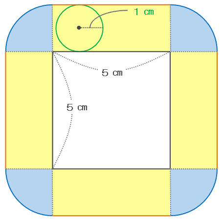 半径1㎝の円が1辺5㎝の正方形のまわりを1周すると、次の図のように長方形とおうぎ形が4個ずつできます。