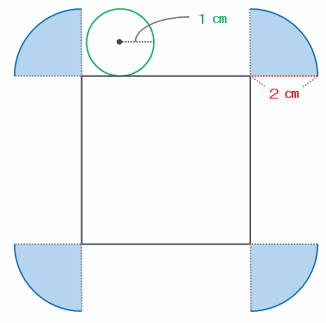 また、次の図の青いおうぎ形の半径も、転がる円の直径と同じく2㎝なので、青いおうぎ形4個の面積は、合わせて2×2×3.14=12.56㎠です。