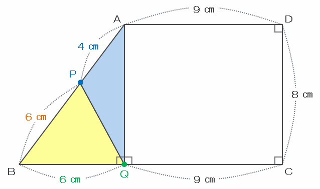 スタートしてから4秒後の点PとQの位置を次の図のように書き込み、ついでに点AとQを直線で結んでみると、辺BCは15㎝、辺BQは6㎝なので、辺QCの長さは15-6=9㎝になります。
