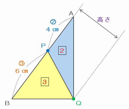 また、次の図の三角形APQとPBQは、底辺をそれぞれAP、PBとすると高さが等しいので、面積比は底辺比と同じく4㎝:6㎝=2:3になります。