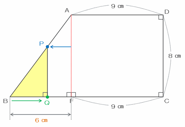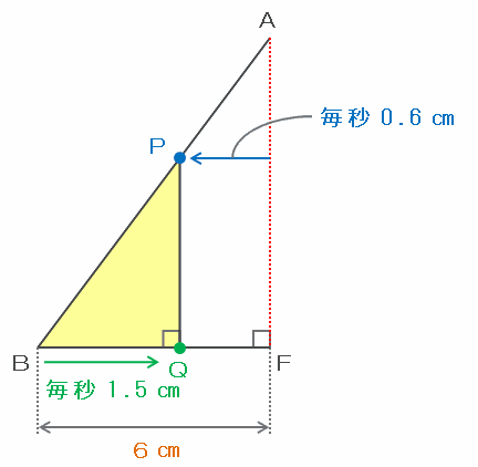 三角形PBQが初めて直角三角形になるのは、下の図の辺PQが赤い辺AFと平行になったときであり、そのとき「辺AFと点Pとの幅」と「点BからQまでの距離」の合計は、辺BFの長さと同じく6㎝になっています。