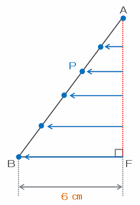 点PがAからBへと進むにつれて、赤い辺AFと点Pとの幅は次の図のように少しずつ広がっていき、点PがBに到着したときには、その幅が辺BFの長さと同じく6㎝まで広がります。