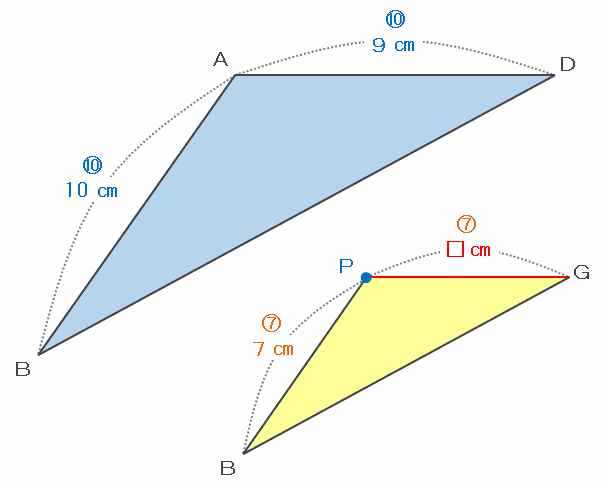 三角形ABDとPBGは相似なので、次の図のように2つの三角形を分離して比べてみると、辺ABとPBの長さの比は10㎝:7㎝=10:7になっていることが分かります。