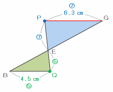 次の図の三角形PEGとQEBは8の字相似であり、辺PGとBQの長さの比が6.3㎝:4.5㎝=7:5となることが分かったので、この問題で求めたい辺PEとEQの長さの比も7:5になります。