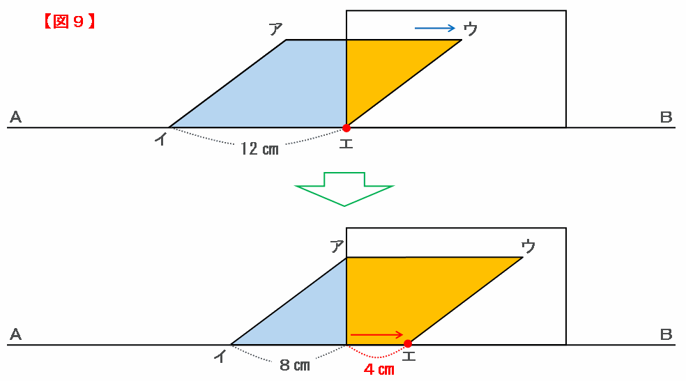 上の2つの図を見れば分かるように、どちらの場合も赤い点が4㎝動く間は重なりの部分が四角形になっています。