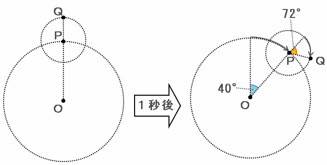 Pは、Oを中心とする円の周上を時計回りに一定の速さで動きつづけ、Oのまわりを1周するのに9秒かかります。このとき、Pを中心とする円もPと一緒に動きます。また、Qは、Pを中心とする円の周上を時計回りに一定の速さで動きつづけ、Pのまわりを1周するのに5秒かかります。