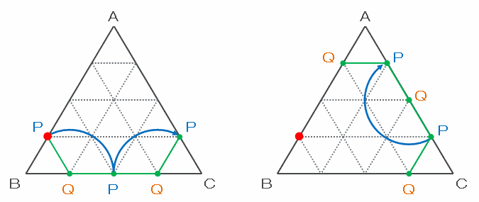 この図のように、点Qを中心として3回目に回転移動したとき、点Pは辺AB上のスタート地点へ戻ります。