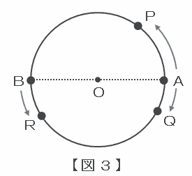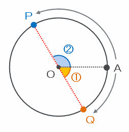 次の図のように、3点P、O、Qが初めて一直線になったとき、点PとQが進んだ角度の合計は180度になっています。