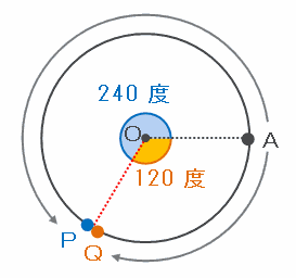 次の図のように点PとQが初めてぶつかったときは、2つの点が進んだ角度の合計は360度になっているので、それを1:2に比例配分してみると、