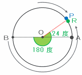 したがって、次の図のようにもし点Rが28秒でBから180+24=204度進むと点Pと出会ってしまうので、点Rの速さはそれよりも遅いはずです。
