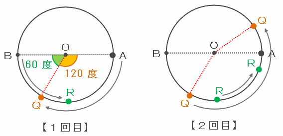 点Qは、点Pと1回目に出会うまでの10秒間でAから時計回りに120度進み、その後は反時計回りに進んで再び点Pと会います。