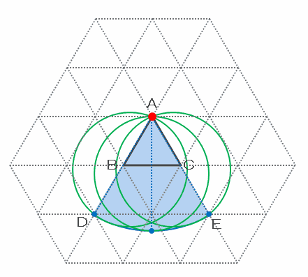 また、この図のピンク色の部分は緑色の円が頂点AとBで引っ掛かって絶対に通過できないので、その部分に斜線を引いてはいけません。