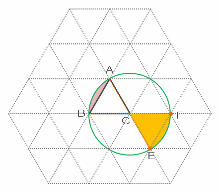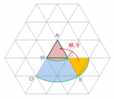 次の図のオレンジ色の部分をピンク色の部分に移すと、青い部分とオレンジ色の部分の面積の合計はおうぎ形ADEと等しくなります。