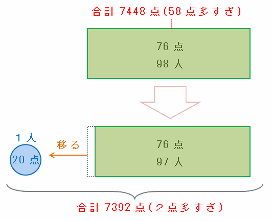 ただ、それだと98人の合計点が7448-7390=58点多すぎなので、次の図のように98人のうちの1人だけ「76点とった」から「最低の20点だった」に移ってもらいます。