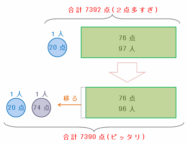 上の図の状態でも、98人の合計点があと7392-7390=2点多いので、次の図のように97人のうちの1人だけ76-2=74点とったことにしてもらいます。
