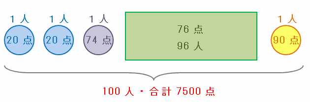 また、最高の90点と最低の20点をとった人が次の図のように少なくとも1人ずつはいるので、残った100-2=98人の合計点は、7500-90-20=7390点です。