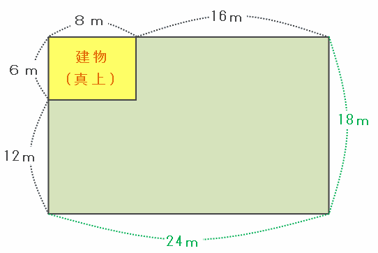 この土地を次の図のように真上から見ると、影をつけた部分の面積は、たて6+12=18mで横8+16=24mの長方形の面積から、建物の面積を引けば求められることが分かります。