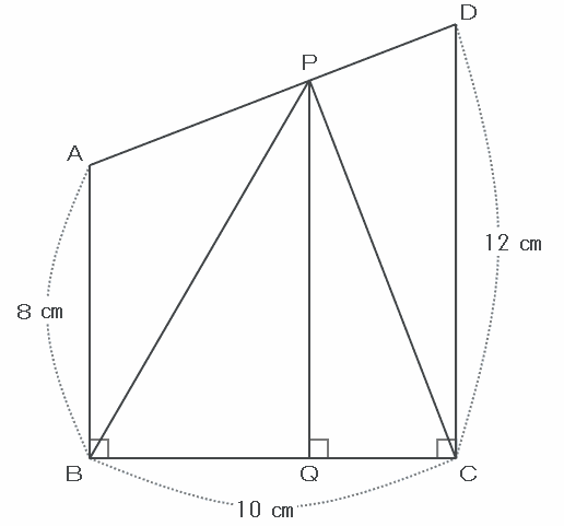 次の図の三角形PABと三角形PCDの面積が等しいとき、PQ=( )㎝です。