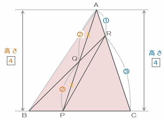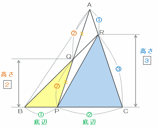 また、この2つの三角形は底辺をそれぞれBQ、QRとすると高さが共通なので、底辺比と面積比が等しいです。