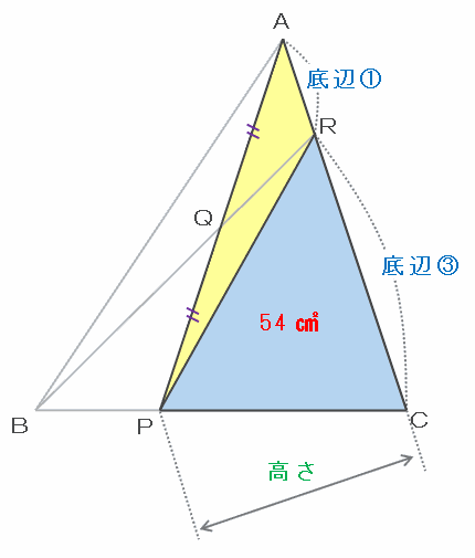 つまり、上の図の三角形RPCの面積はQBPの3÷1=3倍であり、QBPの面積が18㎠であることも分かっているので、答えは18×3=54㎠になります。