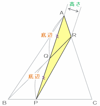 次の図の三角形RAQとRQPは、底辺をそれぞれAQ、QPとすると、底辺も高さも等しくなるので面積も同じです。