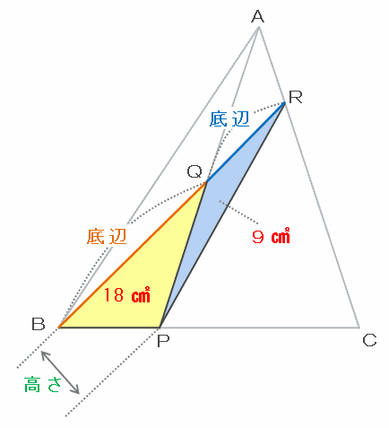 次の図の三角形QBPとRQPの面積比は18㎠:9㎠=2:1です。