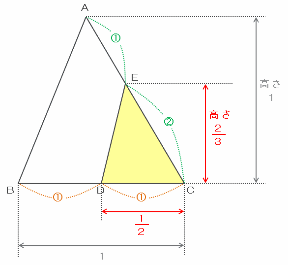 ・三角形CDEの底辺→BD:DC=1:1なので、ABCの底辺の2分の1