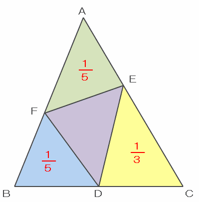 三角形ABCの面積を1とおくと、CDEの面積の割合は3分の1、FBDとAFEの面積の割合はどちらも5分の1であることが分かりました。