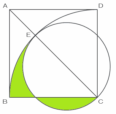 一辺10㎝の正方形ABCDがあります。Cを中心として、半径10㎝の円をかき、対角線ACとの交点をEとし、ECを直径とする円をかくと、次の図のようになりました。このとき、色のついた部分の面積は( )㎠です。ただし、円周率は3.14とします。